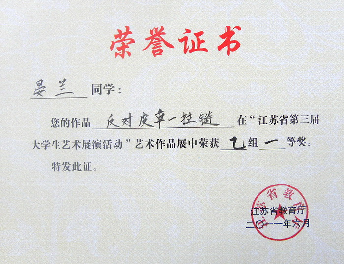 1 | 一等奖 | 反对皮草――拉链 | 乙组 | 平面设计 | 晏兰 | 蔡薇 |