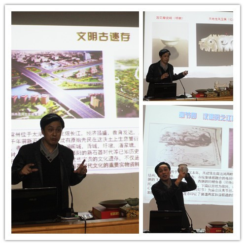 谈鸣先生从常州文明古遗存淹城的历史和出土文物讲起,通过大量图片展示出常州璀璨的历史文化,尤其是现场展示出的具有代表性的常州不同历史时期的工艺珍品实物―秘色瓷荷叶盏、青花瓷香炉,人首鱼身白瓷俑等让师生们对古代能工巧匠的精湛技艺啧啧称赞,仿佛穿越时空与古代文明进行对话。