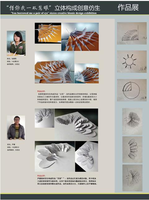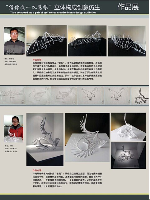 在教学过程中,我们深深地体会到员工突破自我的勇气和艰涩,也欣慰地感受到员工锤炼出原创作品后的喜悦和慰藉。本次展出一年级两个班的部分线材仿生构成和面材仿生构成作品,不一定都很有意味,但都基本具备一定的形式美感。作品也许还稍显稚嫩,对于一年级的员工我们要更多的予以鼓励,宋代诗人杨万里诗云“小荷才露尖尖角, 早有蜻蜓立上头”,是的,透过这些作品我们也可以初步领略原创的艺术魅力,我们也看到了他们成为设计师的潜质。