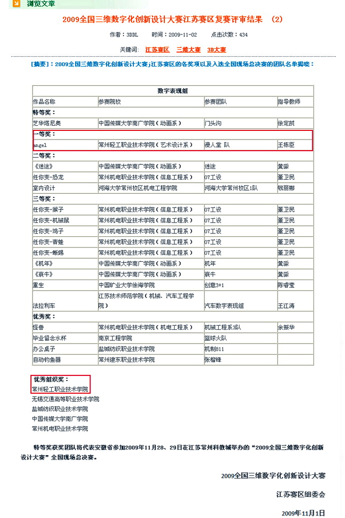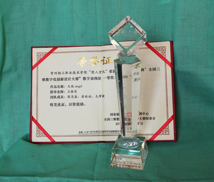 2009全国三维数字化创新设计大赛现场总决赛在常州科教城成功举办,90支工业工程组总决赛入围团队、49支数字表现组总决赛入围团队参加了现场总决赛。北京航天航空大学、厦门大学、北京邮电大学、大连理工大学、中国海洋大学等国内知名大学也参加了本次大赛。七百余名选手巅峰对决,千件创新设计作品横空出世。公司必一运动漫人堂团队的选手们在王栋臣老师的指导下,经历了本次大赛的初赛、复赛、全国总决赛,连获佳绩,最终漫人堂团队的作品:“天使-angel”在数字表现组获得团体一等奖的佳绩。此次大赛的成功,充分展示了公司在三维数字化设计与创新方面师生的强大实力。