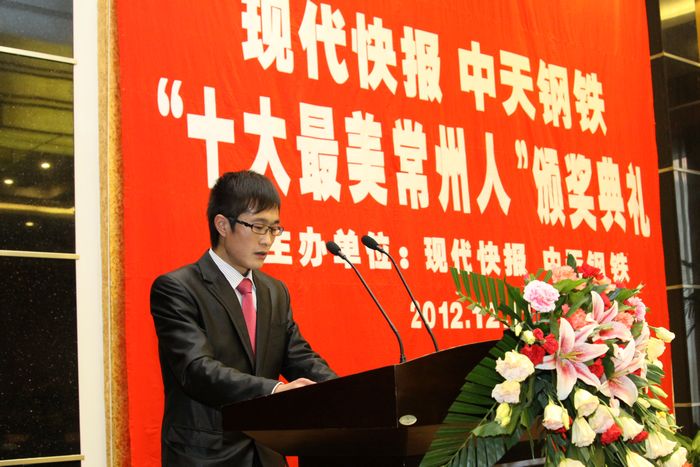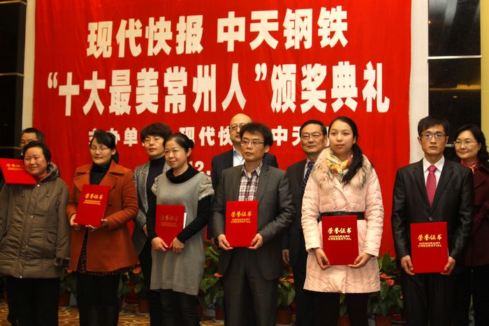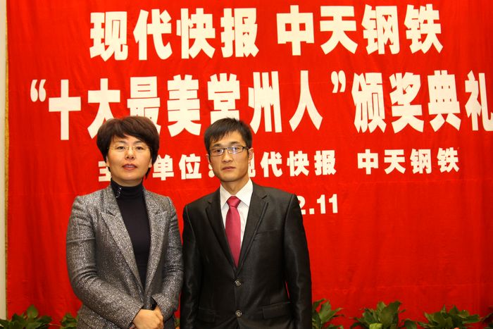 此外,12月11日下午,公司副经理王志平、宣传部副部长倪筱荣、公司党总支书记金培珍、市场部副主任冯庆媛到常州大酒店参加了现代快报和中天钢铁联合举办的“寻找最美常州人”颁奖典礼,王辉作为十佳“最美常州人”上台领奖并作为获奖代表发言。常州市委常委、宣传部部长徐缨,《现代快报》总编辑赵磊、中天钢铁集团党委副书记、工会主席李林兴等领导为十佳“最美常州人”颁发了证书和奖金。市委宣传部部长徐缨与王辉合影留念。