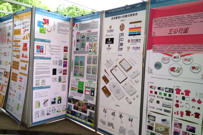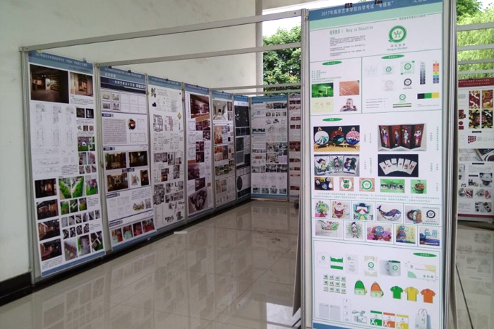 于是,一次题目为 “给你们点颜色看看”的专接本课程作品展就这样勾画而成。取材手到擒来,同学们将自己本学期的课堂作业进行了筛选和梳理,选取任课老师评价较高的课堂作业在指导老师的提点下进行二次加工,使原本较为粗糙和稚嫩的作品有了一个质的飞跃。场地就选取在专业教学楼下的临时展位上,虽然硬件条件没有可夸耀之处,与正规展厅有着天堑般的差距,但是从功能性上来讲,亦可满足作品展示的需要初衷。