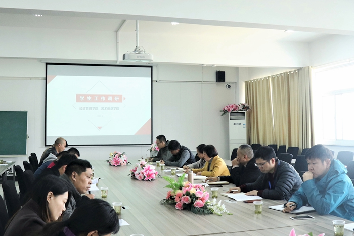 经管公司党总支副书记汪洋代表公司做员工工作汇报。他对经管公司员工基本信息、生源结构、班主任和辅导员队伍建设做了概述,并就教学学工联动机制、突发事件一案一例精细化归档、员工意识形态教育等工作向与会人员做了重点汇报,同时针对员工管理工作中存在的问题和解决方案做了详细的阐述。艺术公司党总支副书记赵云就其公司的员工管理工作做了现场汇报。