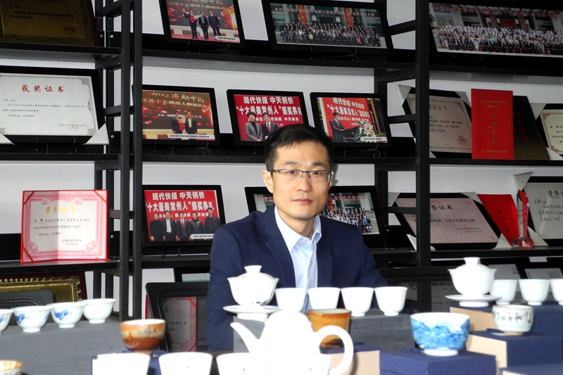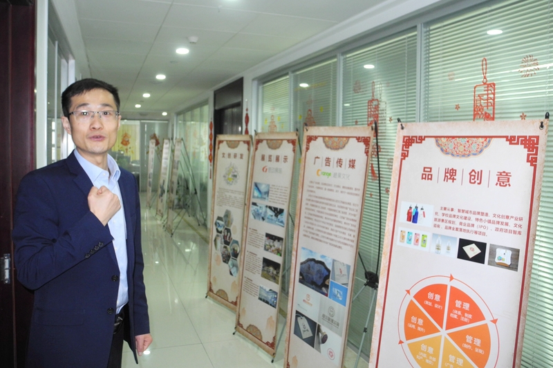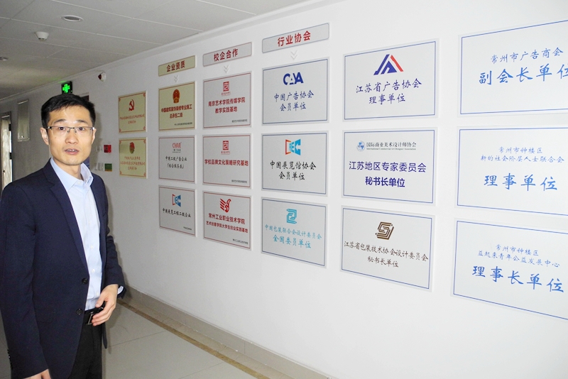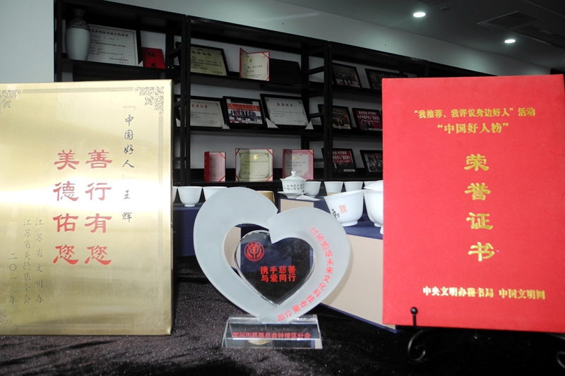 位于钟楼区的常州科技街占地3.7平方公里,王辉的江苏感动未来文化科技有限公司是该区域最大的广告文创公司了。公司租用了1000多平米的办公用房,王辉带我走进他的406室展示厅。展示厅内满桌摆放的都是公司为客户设计制作的陶瓷礼品,此外最霸占眼球的,就是展架上那上百帧照片和证书:中国展览工程企业一级资质、中国广告企业一级资质、中国展览馆展陈工程设计施工一体化一级资质、建筑装修装饰工程专业承包二级资质、建筑幕墙工程专业承包二级资质,江苏省创业典型、江苏省广告协会理事单位、江苏省优秀诚信服务企业、常州市守合同重信用企业、常州市民营科技企业、常州市广告商会副会长单位,常州市广告商会秘书长……让我意外的是:展架的中央竟然出现了“中国好人”铜牌!