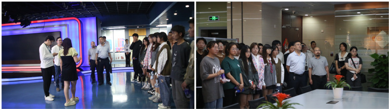 来到二楼的新闻中心,新闻中心主管唐晴,带领同学们参观了演播室,并向员工们详细介绍了新闻报道的采编流程和不同岗位的职能,展示了新闻媒体的责任与使命。员工们饶有兴趣地观摩着新闻制作的各个环节,了解到新闻报道背后的辛勤努力和职业要求,这让他们对传媒行业产生了更深层次的认知。