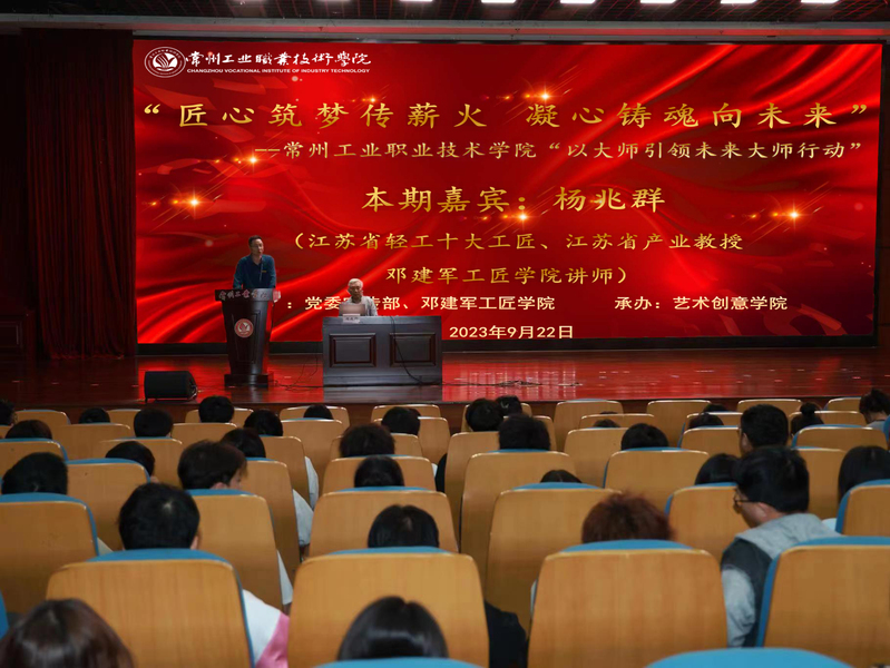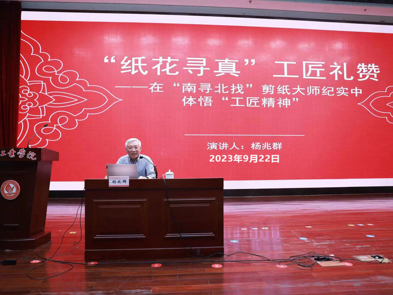 杨兆群曾被中央文明办授予“敬业奉献好人”,被中国文明网以抢救民间剪纸艺术为己任的刻纸文化坚守者,入选2018年“中国好人”榜。他通过自己“南寻北找” 寻访全国76位剪纸大师,收藏4.5万幅剪刻纸精品的纪实影像,结合作品学习欣赏与专家评价等形式,用“四个小故事”、“三个传承案例”和“一生梦想”展开讲述,情感真挚,娓娓道来,阐释剪纸大师们“爱岗”、“精业”和“奉献”的三个层次的职业精神境界,启发员工们从中体悟 “工匠精神”,激活他们感知美、欣赏美、创造美的本能意识。讲座深深打动现场的每一位师生,他们争相与大师同台合影留念。