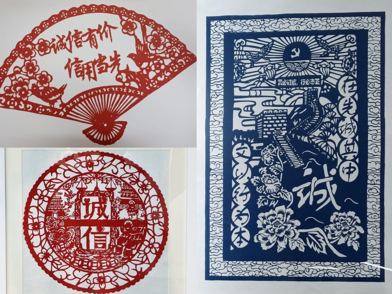 22广告331班联合非遗创新研学工坊,将诚信教育融入班级文化建设,以非遗金坛刻纸的形式创作了一系列以诚信为主题的刻纸作品,警醒同学们时刻以诚信为本,坚守内心,养得一身浩然正气。