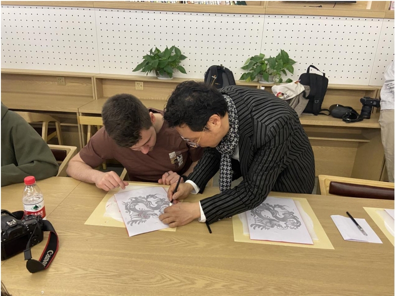 龙文化是中华民族传统文化的精华和典型代表,2024年正值甲辰龙年,为此,主办方特意挑选了“龙”这个神秘形象,作为刻纸作品表现对象,向德国师生展示中华民族图腾的艺术魅力。活动伊始,金坛刻纸传承人李斌老师向德国员工们介绍“龙”图腾的由来和样式,并对剪刻纸艺术中的基本纹样一一讲解,如月牙纹可以用作动物的眼睛和身上的花纹,锯齿纹可以用作动物身上的毛发,柳叶纹则可以用来表现为叶子、花朵……随后,员工们根据李老师的指导,依着从里到外、从左到右、从上到下、从繁到简的原则,开始着手龙纹样的刻纸创作。教室里,刻刀声沙沙作响,师生们神情专注、屏气凝神,用心体味着每一根线条的刻制过程,一丝不苟、精益求精,不经意间传承中华优秀传统文化中蕴含的工匠精神。