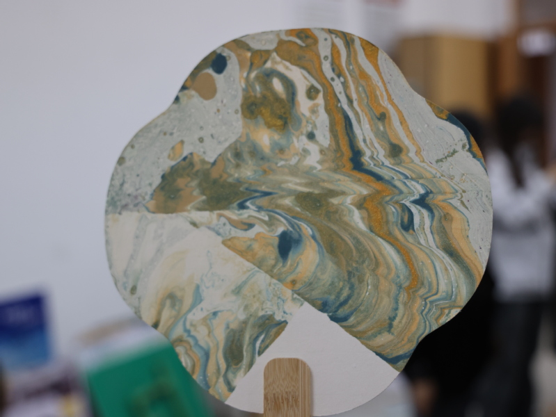 在活动开始之前,魏馨雨同学给大家详细讲解了制作过程,讲解完毕后,同学们以漆为笔,以水作画,纷纷动手实践。他们将自己喜欢的染料放入清水中,并用搅拌棒不停搅拌做出纹路,随后,将精心挑选的扇面垂直轻放到水中,花纹随着水的流动在扇面上形成美丽的画卷。紧接着,同学们小心翼翼地将扇子拿出水面,待漆散开后扇面上便会形成各种各样的图案,就这样,一把属于同学们自己的漆扇就此诞生。