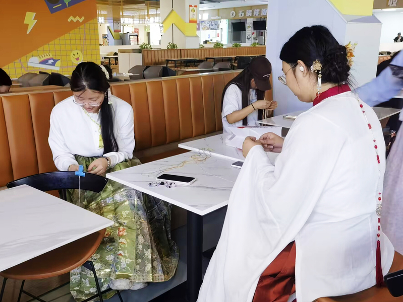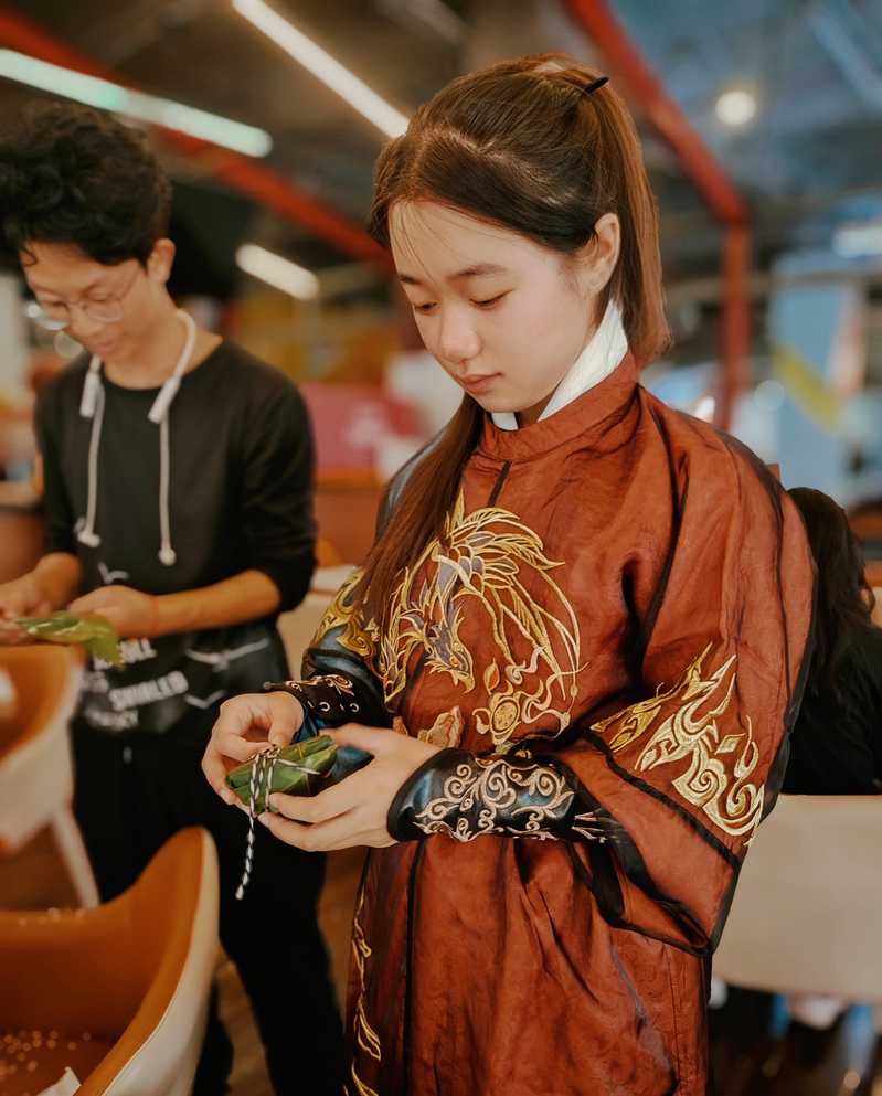 本次活动分为包粽子和编五彩绳两个环节。活动伊始,汉服社的社员们身着精美的汉服,与友联社的同学们一同忙碌起来。餐桌上摆满了粽叶、糯米、红枣、蛋黄等包粽子所需的材料。在有经验的同学的指导下,同学们纷纷动手尝试包粽子,从最初的笨拙生疏到后来的熟练自如,每个人的脸上都洋溢着成功的喜悦。