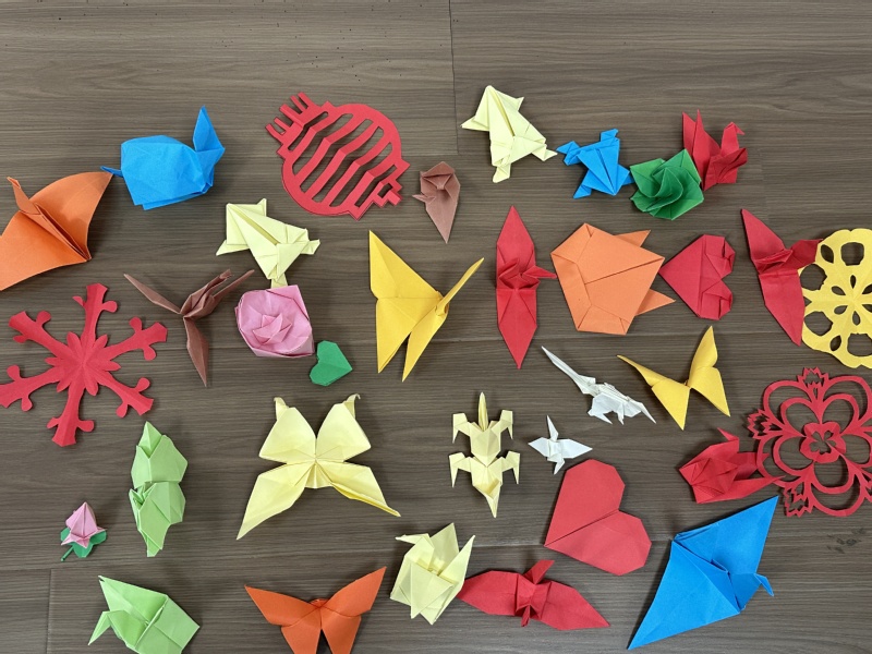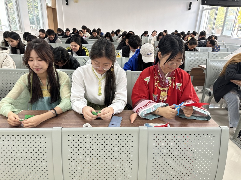 活动现场,子衿汉服社的社员们身着汉服,引领同学们体验剪纸与折纸的乐趣。红纸翻飞,剪刀起落,一幅幅精美的剪纸作品在社员们的巧手下诞生,寓意着吉祥与美好。同时,折纸区域也吸引了众多参与者,大家动手折叠出各式各样的纸艺作品,从简单的纸飞机到复杂的千纸鹤,每一件作品都承载着对传统文化的热爱与探索。
