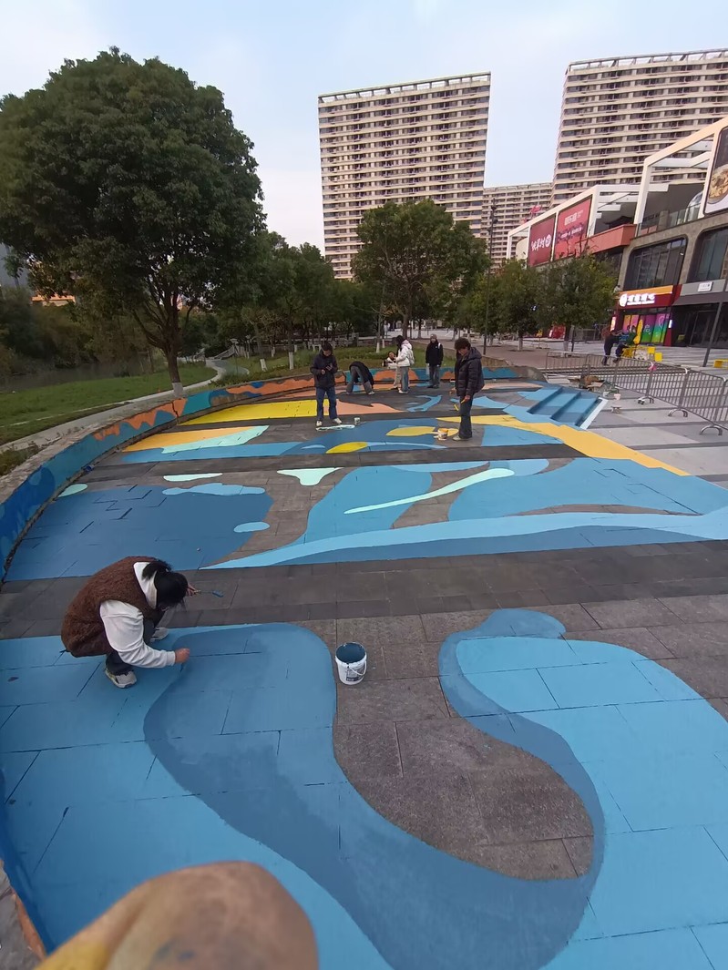 11月26日,B-Sports创绘社完成了科教城碧乐时光2门外露天广场地面彩绘项目“激浪”,这无疑是一次艺术与团队协作的完美体现。在创作过程中,员工们面对恶劣的天气条件,展现出的专业精神和坚持不懈的态度令人敬佩,充分彰显了青年一代的责任感和创造力。增强了同学们多方面素质。