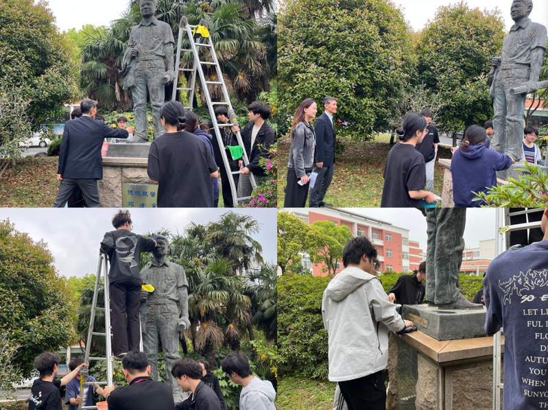故事余韵中,师生们手持工具分组行动。有人半蹲擦拭基座前的一行字:“德技双馨”,有人爬上梯子轻拭塑像眉梢灰尘,24数媒332周恒同学的感悟朴实而深刻:“擦塑像时发现,大国工匠邓建军的目光始终望向教学楼方向,仿佛在看我们的未来。”