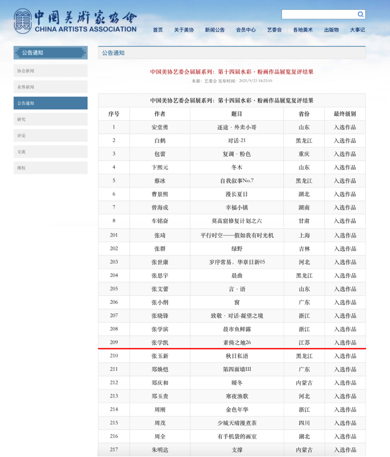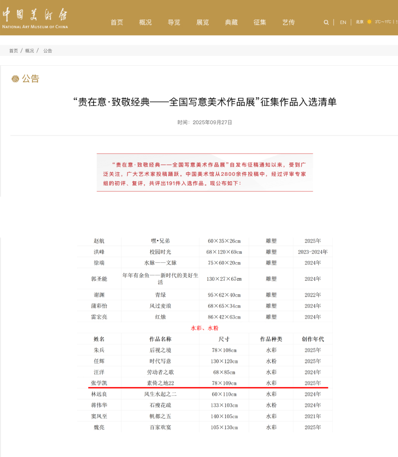 由中国美术馆主办的2025“贵在意·致敬经典——全国写意美术作品展”在北京中国美术馆隆重开幕,张学凯老师品《素倚之地22》入选此次展览。中国美术馆从全国2800余件投稿作品中,经过评审专家组的初评、复评,共评出191件入选作品。其中彩作品入选8件。