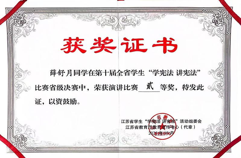 此次赛事竞争激烈,历经校赛选拔推荐、省级初赛的层层筛选,薛舒月同学从百余位高校组参赛者中脱颖而出,成功跻身省级决赛。决赛设置主题演讲与即兴演讲两大核心环节,全面考察选手的宪法认知深度、语言表达能力与临场应变水平。在主题演讲环节,薛舒月以《宪法之光 守护成长》为题,将真挚情感与深刻思考融入演讲之中,以情带声、以思促讲,用生动的表达传递宪法精神。在极具挑战性的即兴演讲环节,她沉着冷静、思路清晰,围绕“法治宣传在家庭、公司与社会生活中的法律实践”展开精准论述,逻辑严密、语言流畅,展现出对宪法精神的深刻理解与扎实的法治素养,最终凭借稳定发挥斩获佳绩。